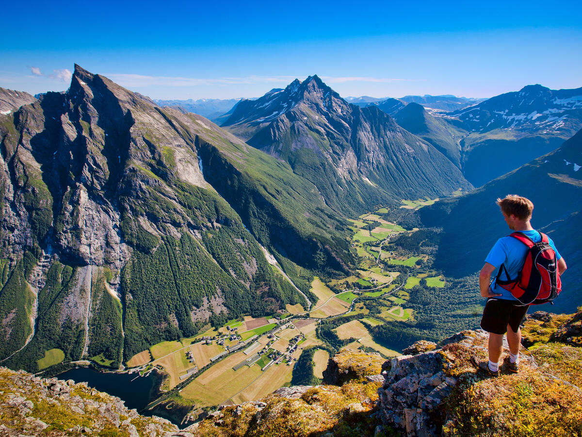 Spectacular Scenery: Romsdalen is renowned for its dramatic and diverse landscapes, featuring towering peaks, cascading waterfalls, deep valleys, and winding rivers. The iconic Trollveggen (Troll Wall), Europe's tallest vertical rock face, dominates the skyline and offers breathtaking vistas for hikers and climbers. The valley is also home to the enchanting Rauma Railway, which winds its way through the rugged terrain, providing passengers with panoramic views of the surrounding wilderness.