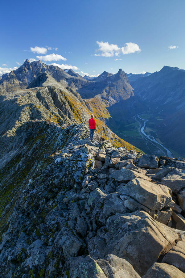 Your journey begins in Trondheim, where you’ll pick up your rental car and set off on a scenic drive towards the mountains. The route takes you through rolling landscapes and into the heart of Trollheimen, one of Norway’s most breathtaking wilderness areas. Upon arrival at DNT Gjevilvasshytta, a historic mountain lodge nestled by the serene Gjevilvatnet Lake, you’ll check in and settle into your cozy accommodations. As the evening unfolds, enjoy a nice traditional Norwegian 3 course dinner in the charming lodge, surrounded by the peaceful beauty of the mountains—setting the perfect tone for the adventure ahead.