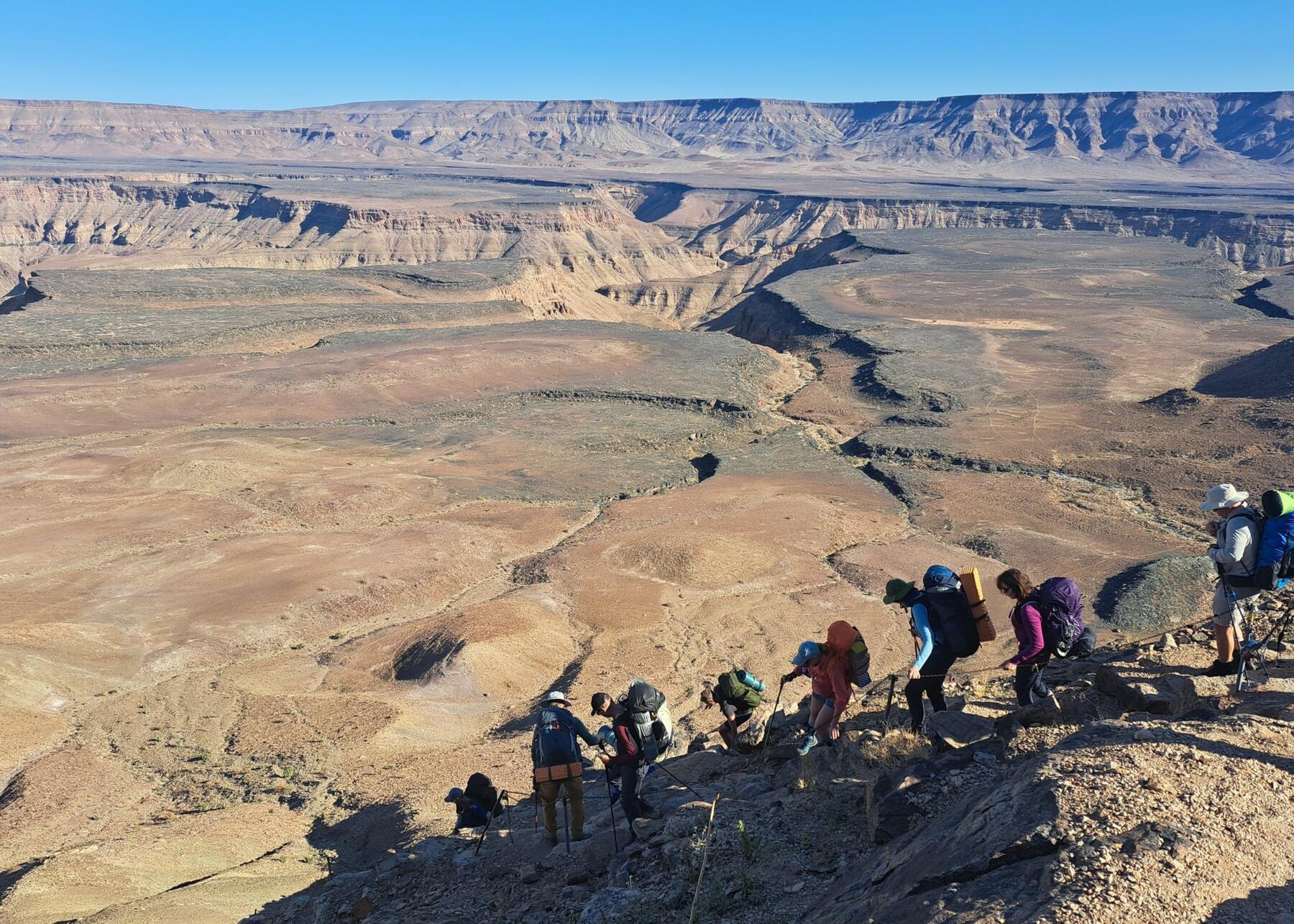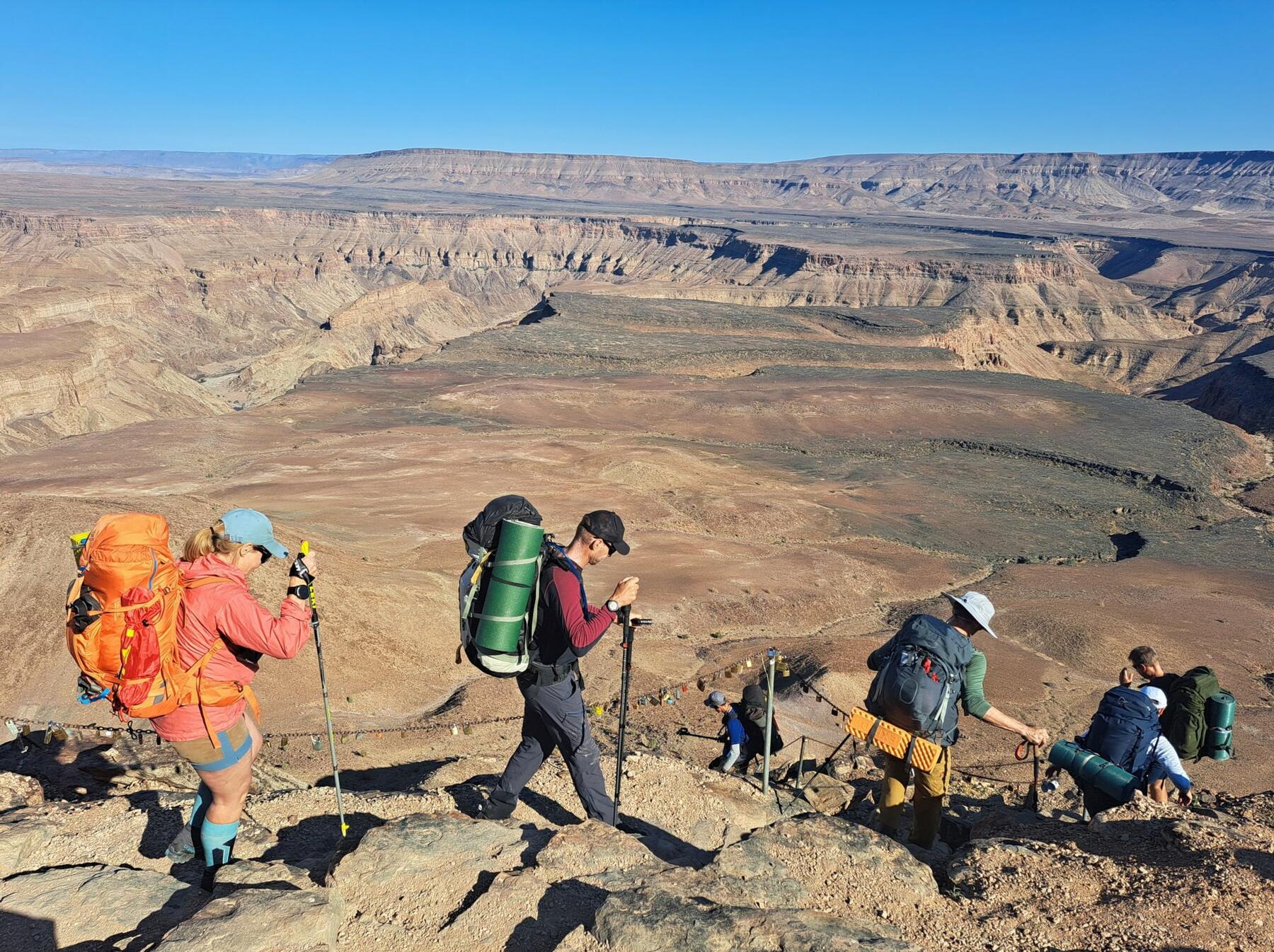 Du trenger en ryggsekk som kan romme det du trenger av personlig utstyr for å overnatte ute i Fish River Canyon. Vi får hjelp av bærere til å bære det meste av fellesutstyr og mat, men alt personlig utstyr må du bære selv, i tillegg til 4 liter vann som vi nesten alltid har med fordi det er usikkert hvor neste vannpost er. På resten av turen bruker vi kun dagstursekk og får resten av bagasjen fraktet.