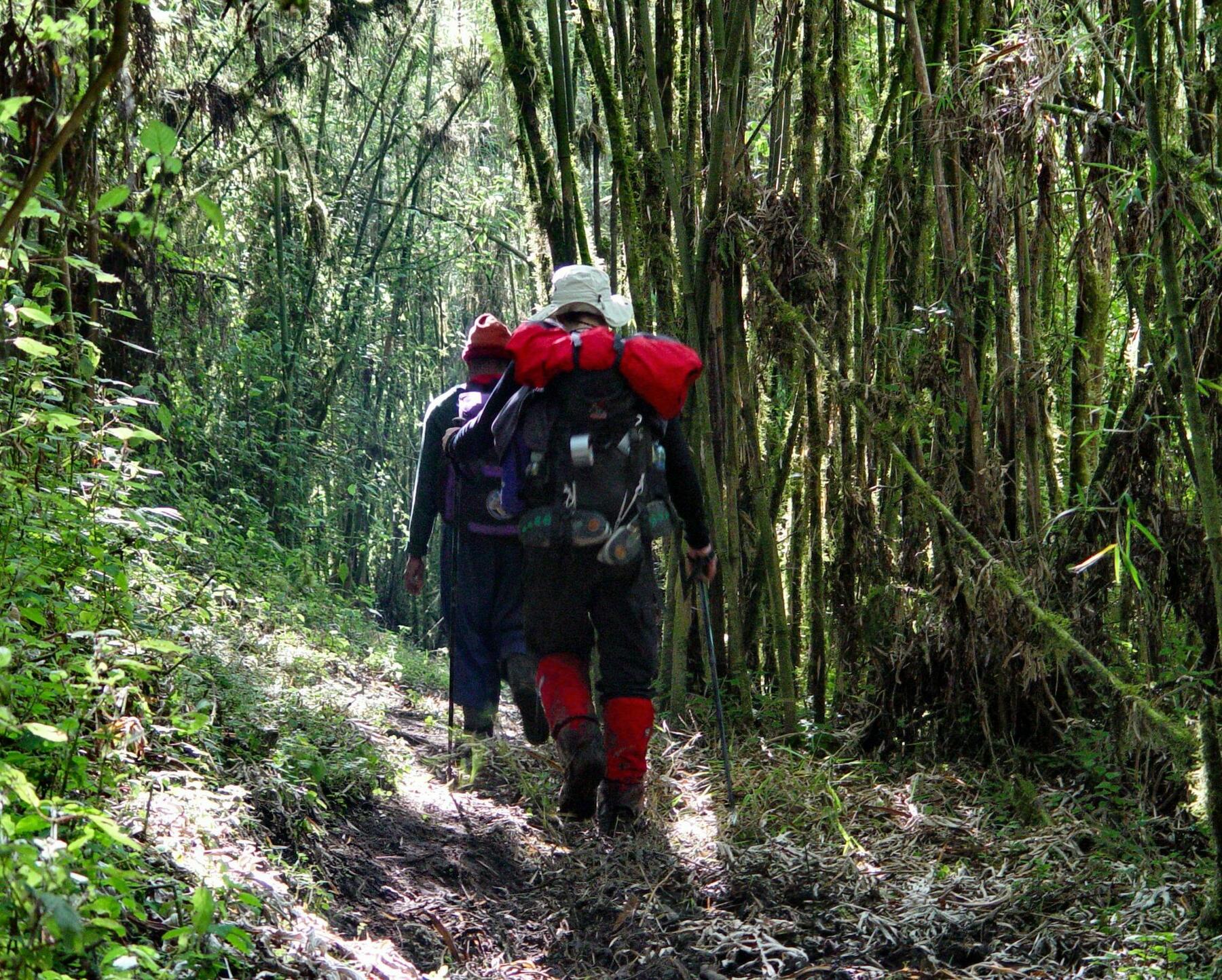Etter en gjennomgang av utstyret kjører vi til Mukorokumi (1560moh) som er startpunktet for fjellturen. Her møter vi guidene og bærerne som skal følge oss på turen mot Margherita Peak. Dagens etappe tar oss gjennom kaffeplantasjer, husmannsplasser og skoler, hvor v møter Bakonzo-folket som befolker Rwenzori-fjellene. Stien følger en en rygg med utsikt over Kasuka- og Isule-dalene, og går deretter gjennom regnskog med utsikt over bambusskogkledde daler. Underveis får vi se sjeldne og ifine planter, og med litt flaks finner vi spor etter sjimpanser. Vi hører kanskje de karakteristiske ropene fra svart-hvite colobusaper og flere spennende fuglearter. Stien fører oss til Rwigho Camp hvor vi overnatter.