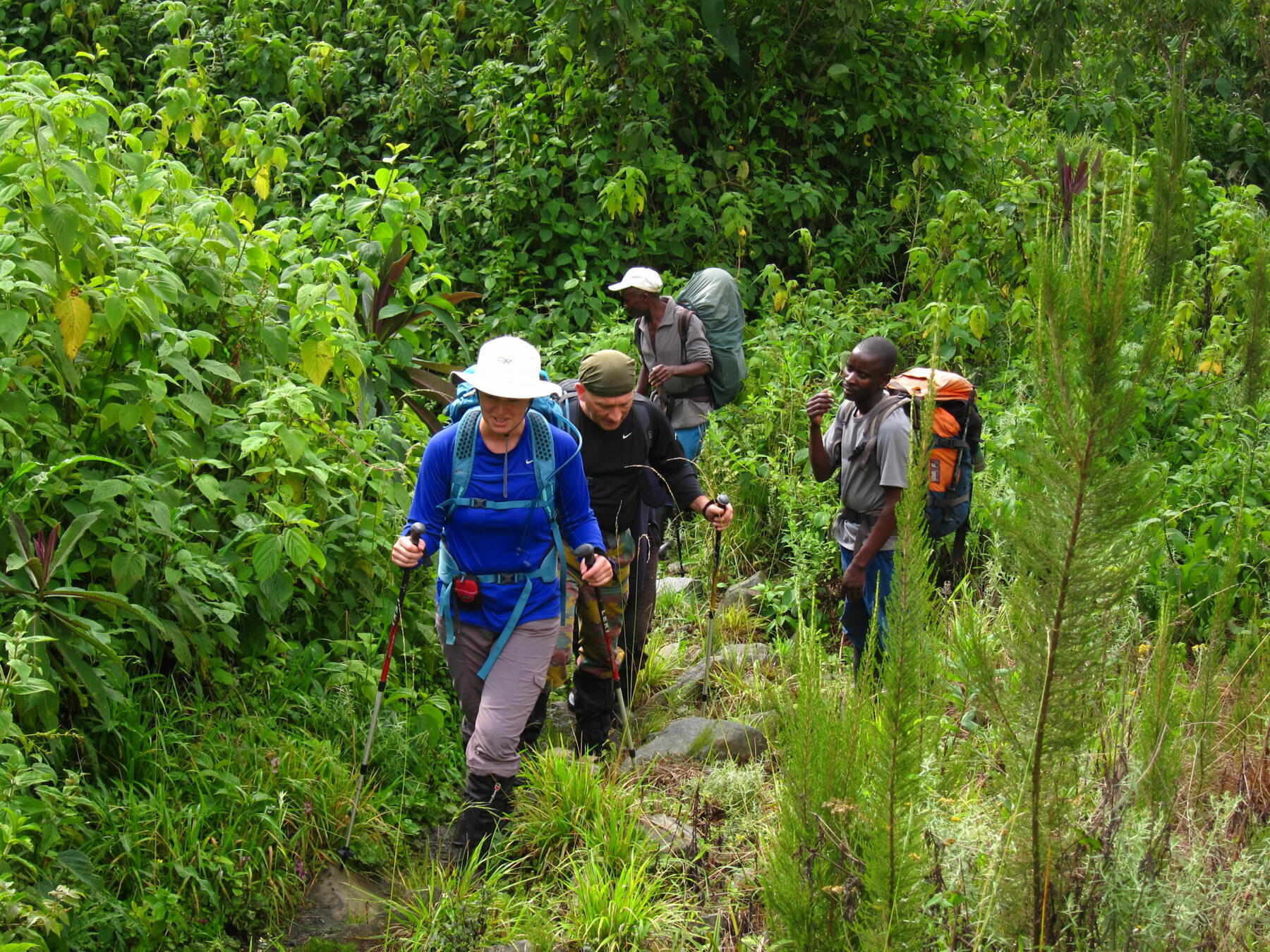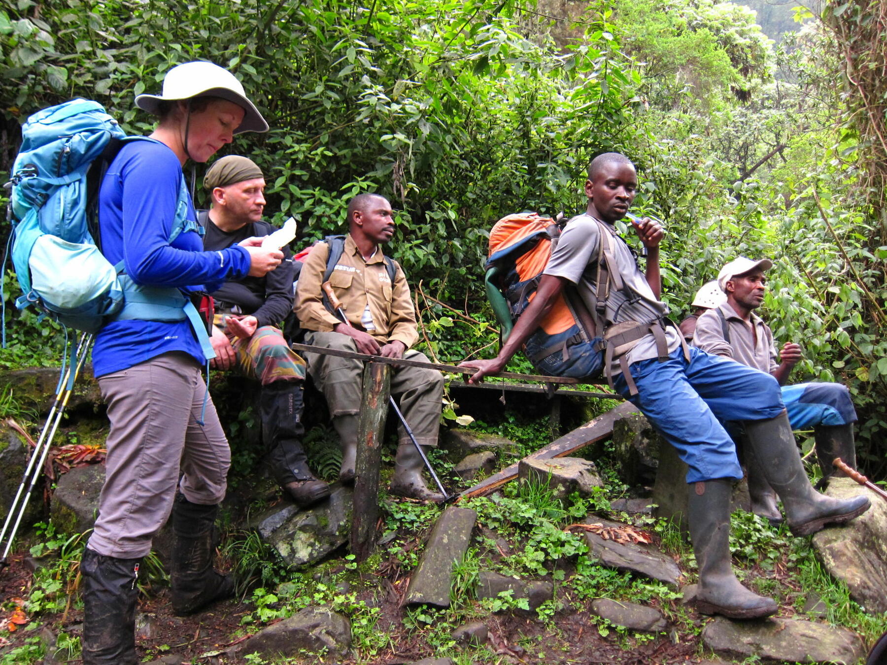 Lokale, engelsktalende guider, safariguider og hjelpere i fjellet (bærere, kokk og sjåfører).