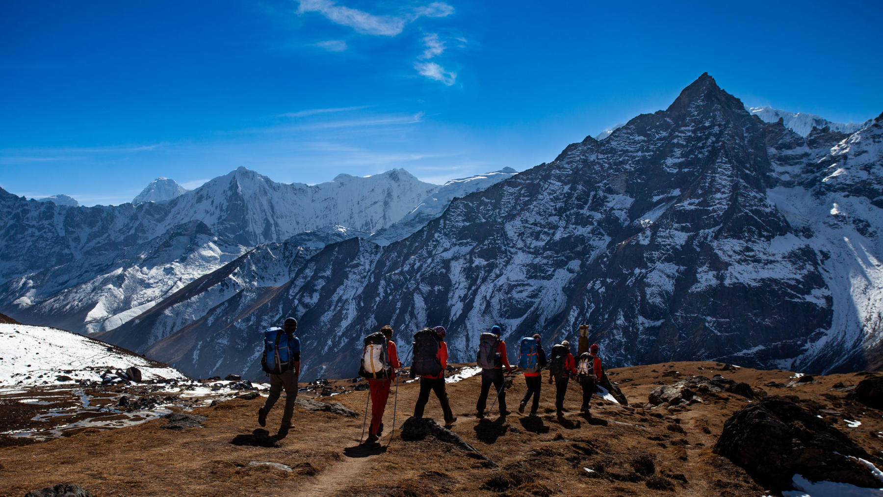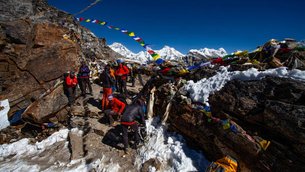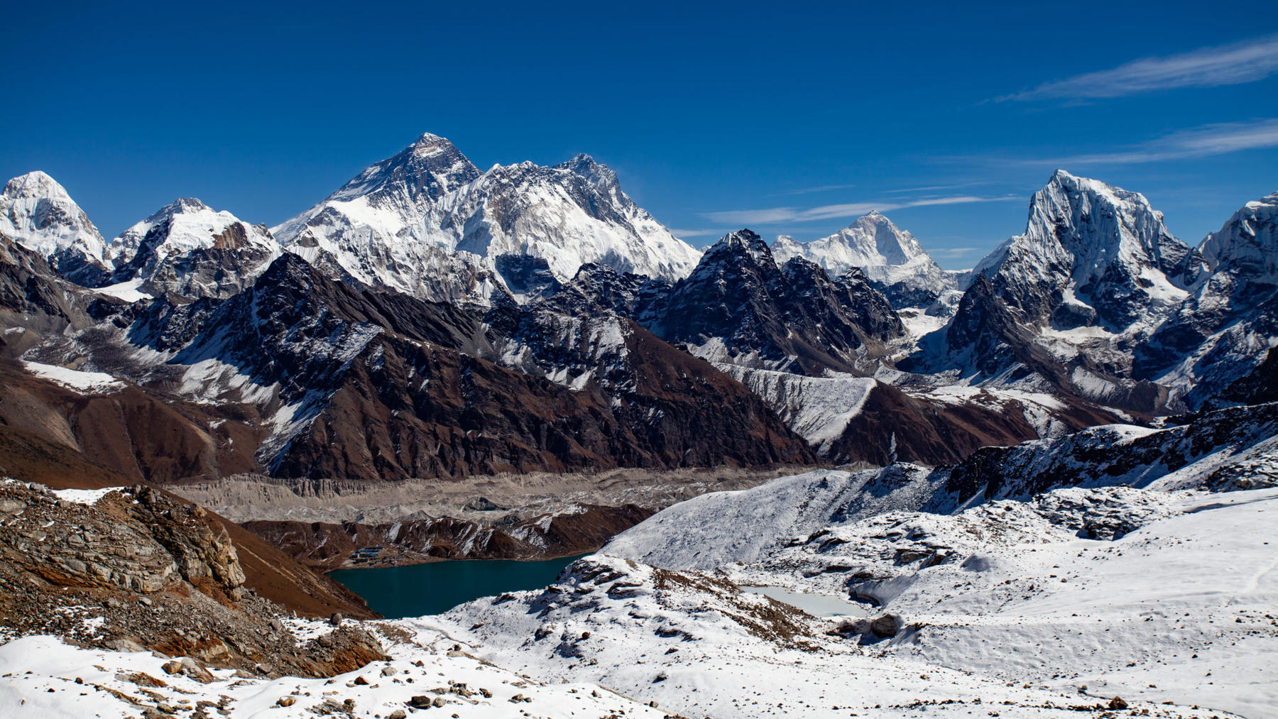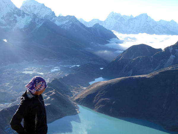 Vi kommer opp i 5300-meters høyde og nyter blant annet et av de aller beste utsiktspunktene mot Mount Everest over oss, og turkisblåe innsjøer under oss.