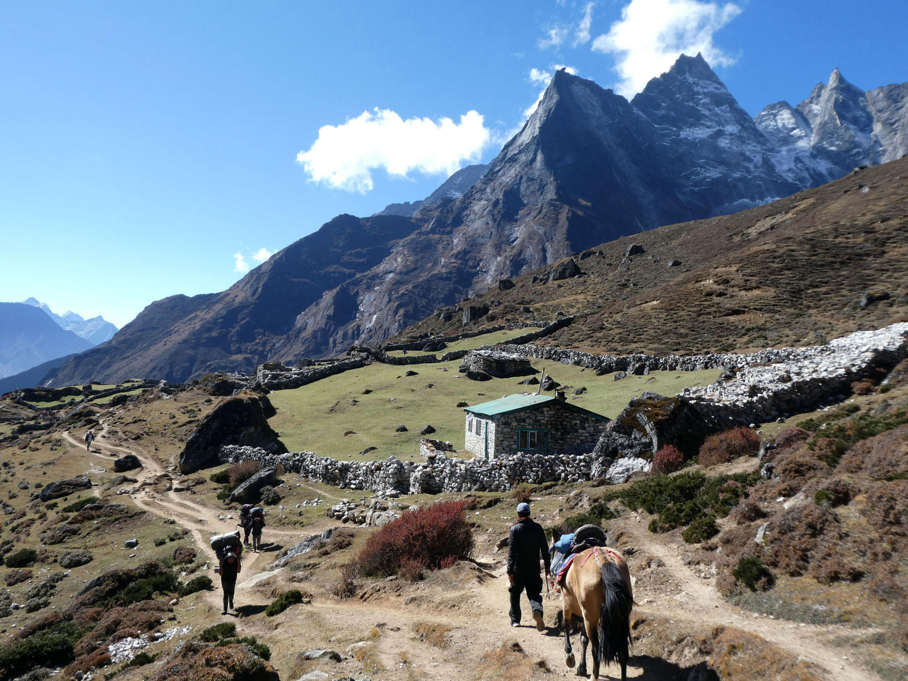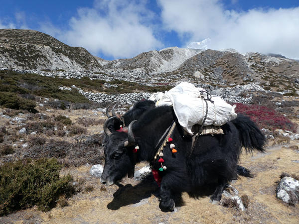 Vi går kun med dagstursekk på dagsetappene, reten av bagasjen fraktes av Jopkyo (en blanding av Yak og Himala ku. Jopkyo trives bedre i lavlandet enn Yak, og er derfor et foretrukket valg på disse turene.