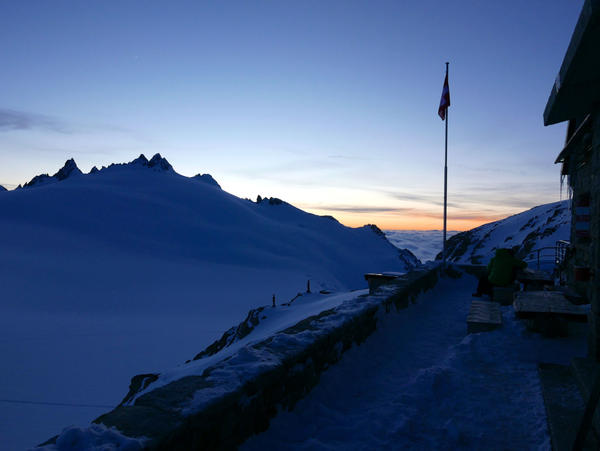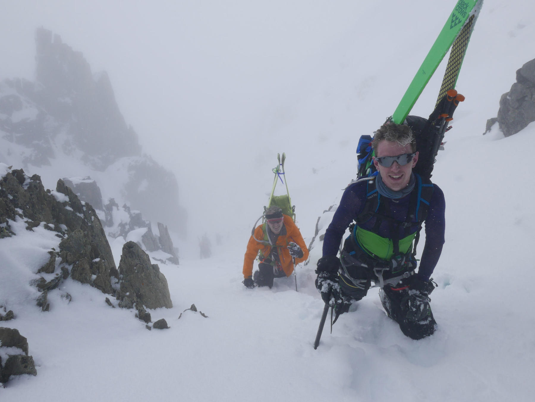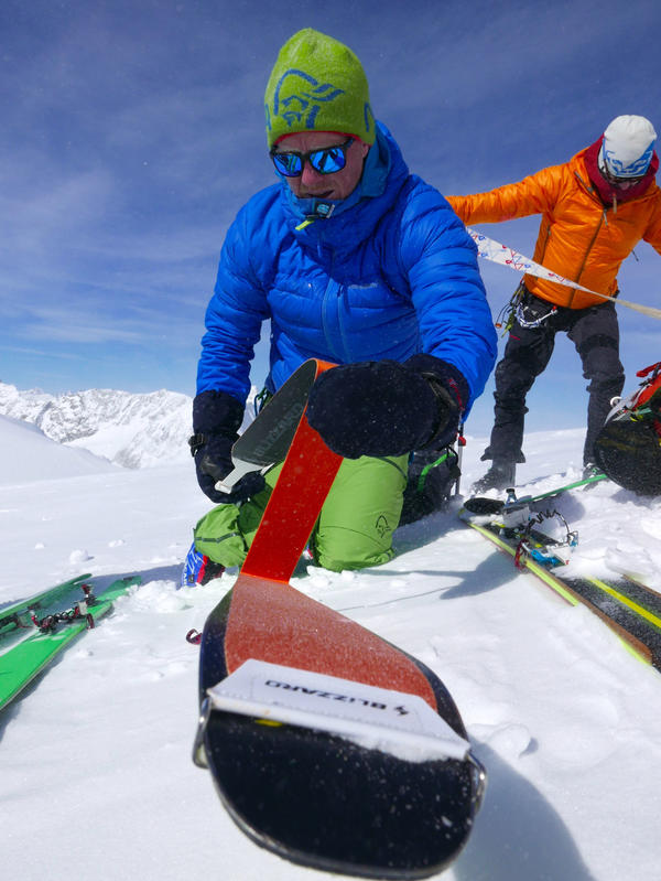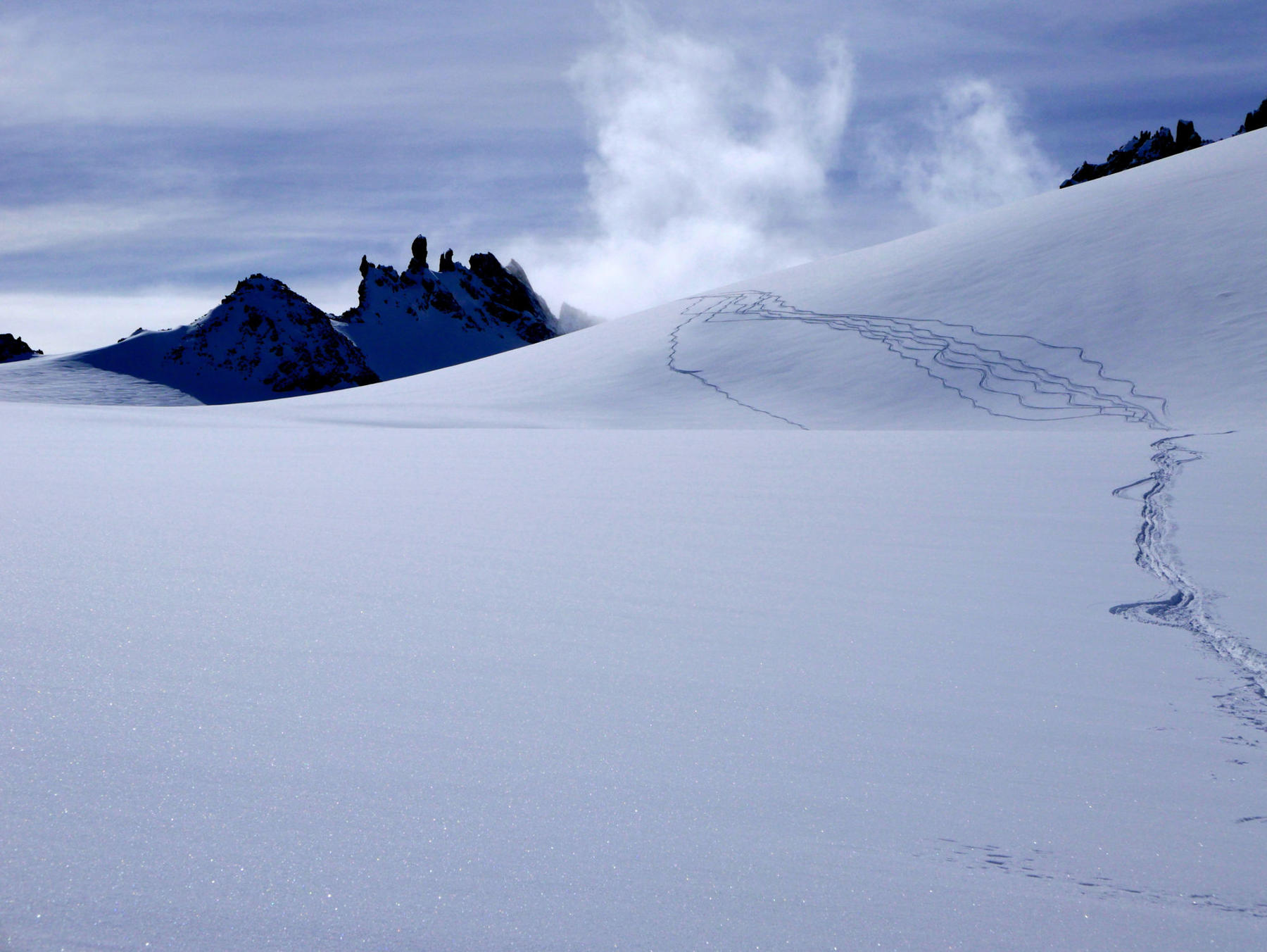 Idag er det en av de lengre klatreetappene. Vi skal ca fire timer opp til Col de Brenay (3639 moh) og å over til Pigne d'Arolla Col (alternativt kan vi gå via Col du Chevre som er mer skjermet og med en litt slakere nedkjøring). Derfra skal vi videre til Vignettes-hytta. På avstand kan nedkjøringen se skummel ut, men etter å ha kikket litt nærmere finner vi de fine linjene i snøen. Dette er en av de mer strabasiøse dagene på turen, så det blir en velfortjent middag idet vi kommer frem til hytta som ligger helt på kanten av Vuibebreen.