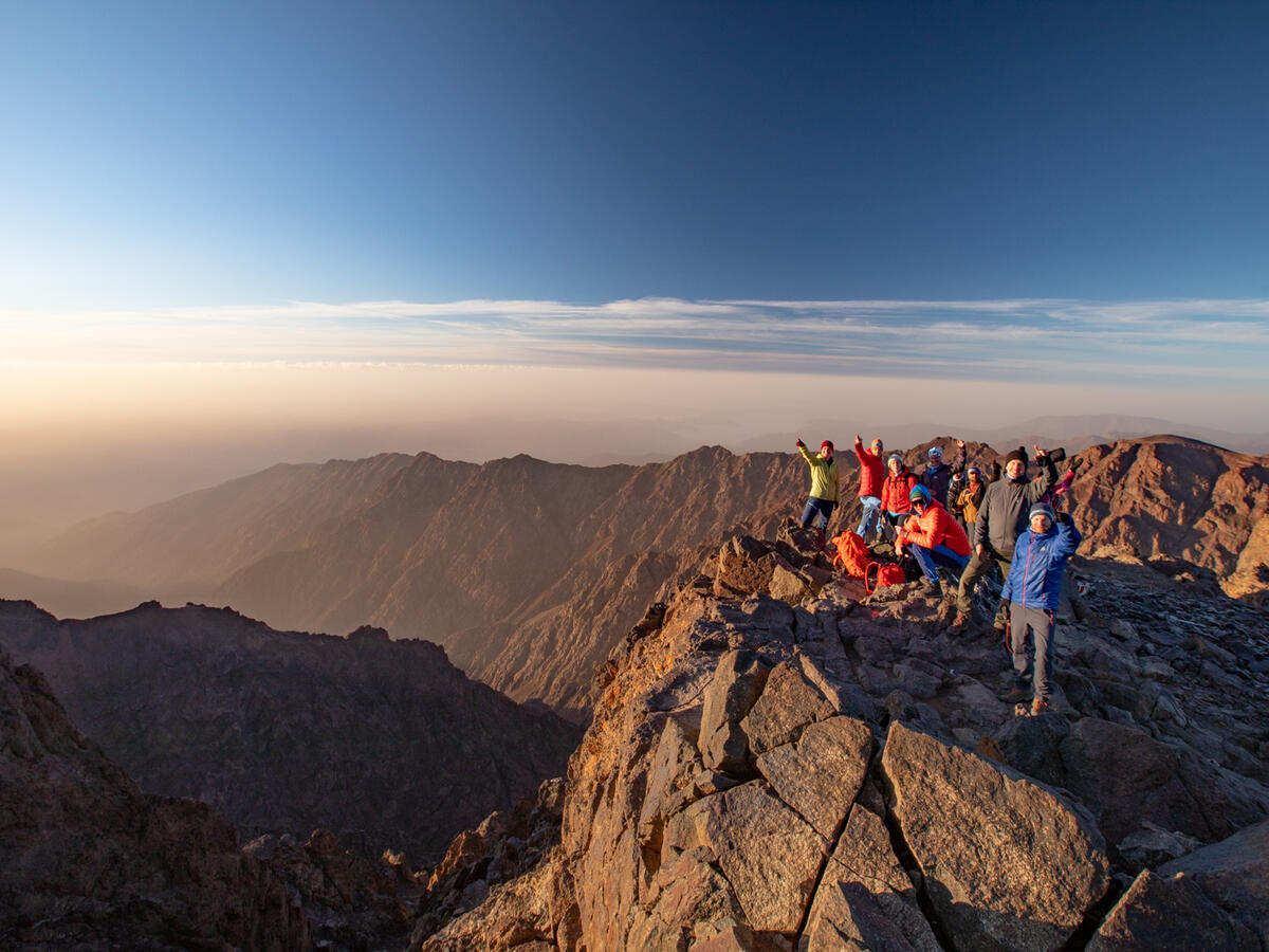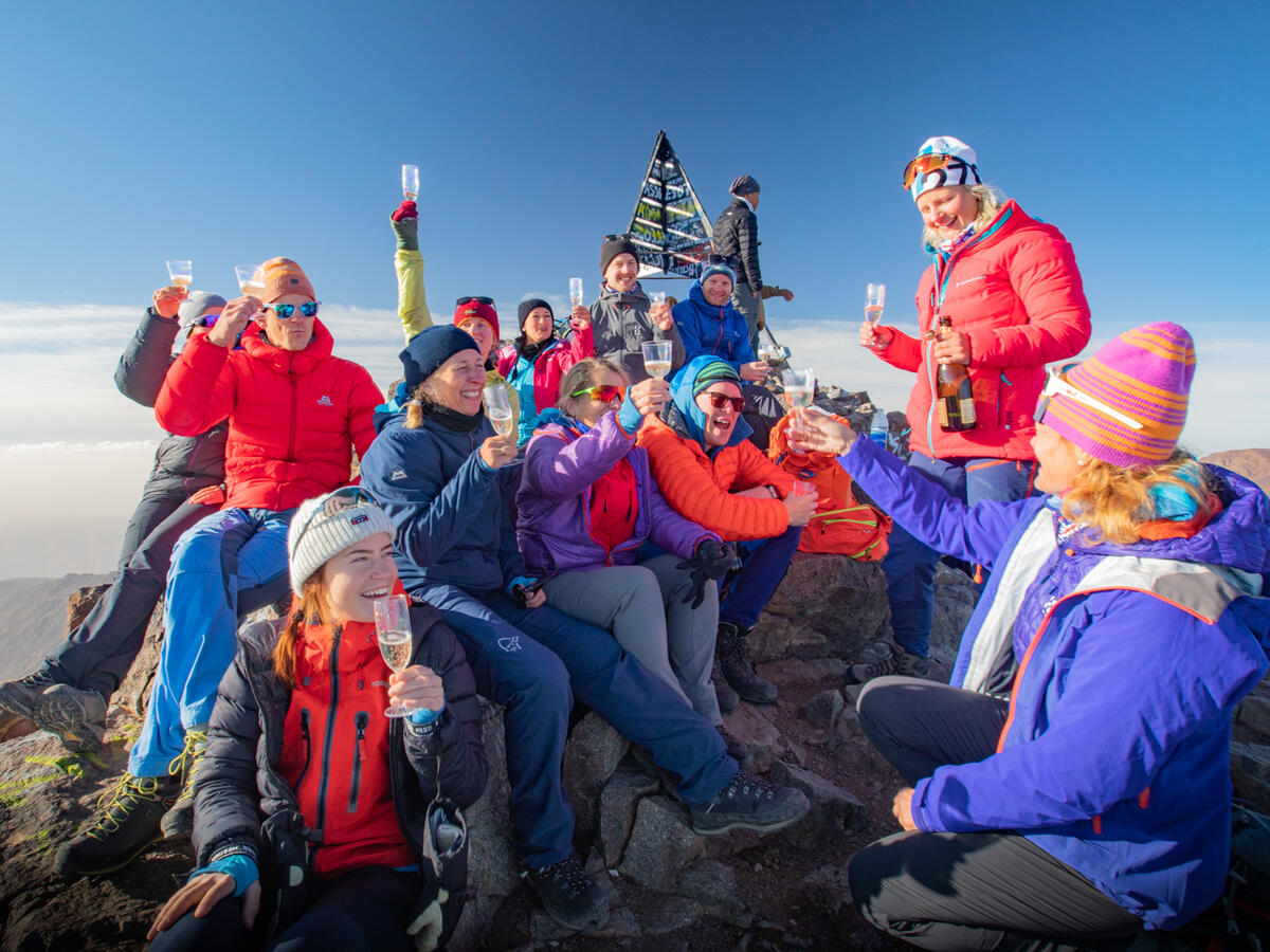 Vi pakker sekkene, legger frem hodelykt og staver og sover lite denne natten. Midt på natten står vi opp og legger ut på turens mest spennende etappe. Jeg føler meg trøtt, sulten, mett og kald på samme tid. Jeg kjemper imot mine indre demoner som lurer på hvor lenge det er igjen til toppen og ber meg gå tilbake, til under dynen der det er varmt og komfortabelt. Skravla har stilnet, og alvorets stund er over oss. Hodelykten viser vei, og fra avstand ser vi nok ut som en selvlysende slange på vei opp fjellsiden der vi går på rekke og rad. Plutselig er det en i gruppen som snur seg og måper - og der, på fjelltoppene bak oss, har solen våknet og kastet sin morgenglans over de høyeste toppene. Det er helt utrolig vakkert! Der og da glemmes negativitet, kjipe tanker og ønsket om å snu. Solen kommer mer og mer til syne, og dytter oss oppover til vi er helt oppe på Nord-Afrikas tak. Vi popper en flaske bobler vi har båret med oss opp, og tar bilder. Mange bilder. Snakk om lagseier og felles mestringsglede!