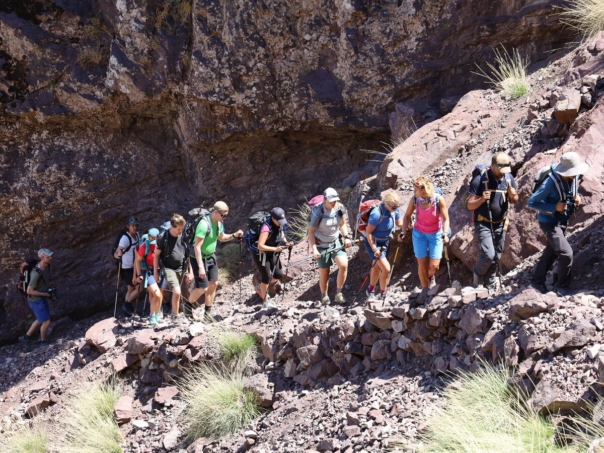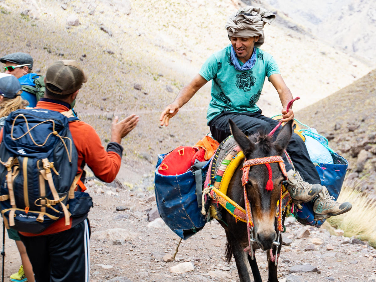 En god natt, noen berberlandsbyer og en 5-6 timers kjøretur senere er vi ved startpunktet for fjellturen vår, Imi Ourhlad. Vi får servert søt berber-te, hilser på det lokale teamet og muldyrene som skal frakte bagasjen vår, og tar beina fatt. Plutselig er vi der, utenfor mobildekning og wifi, i en helt annen verden. Solen skinner, temperaturen er behagelig og stemningen på topp. Vi skravler, hilser på folk vi møter underveis og klikkingen fra stavene våre setter takten.