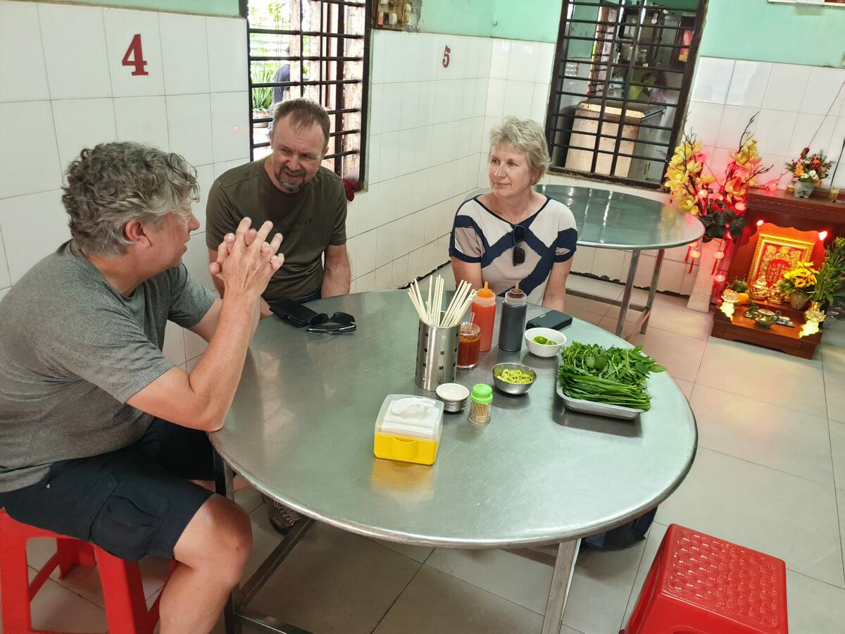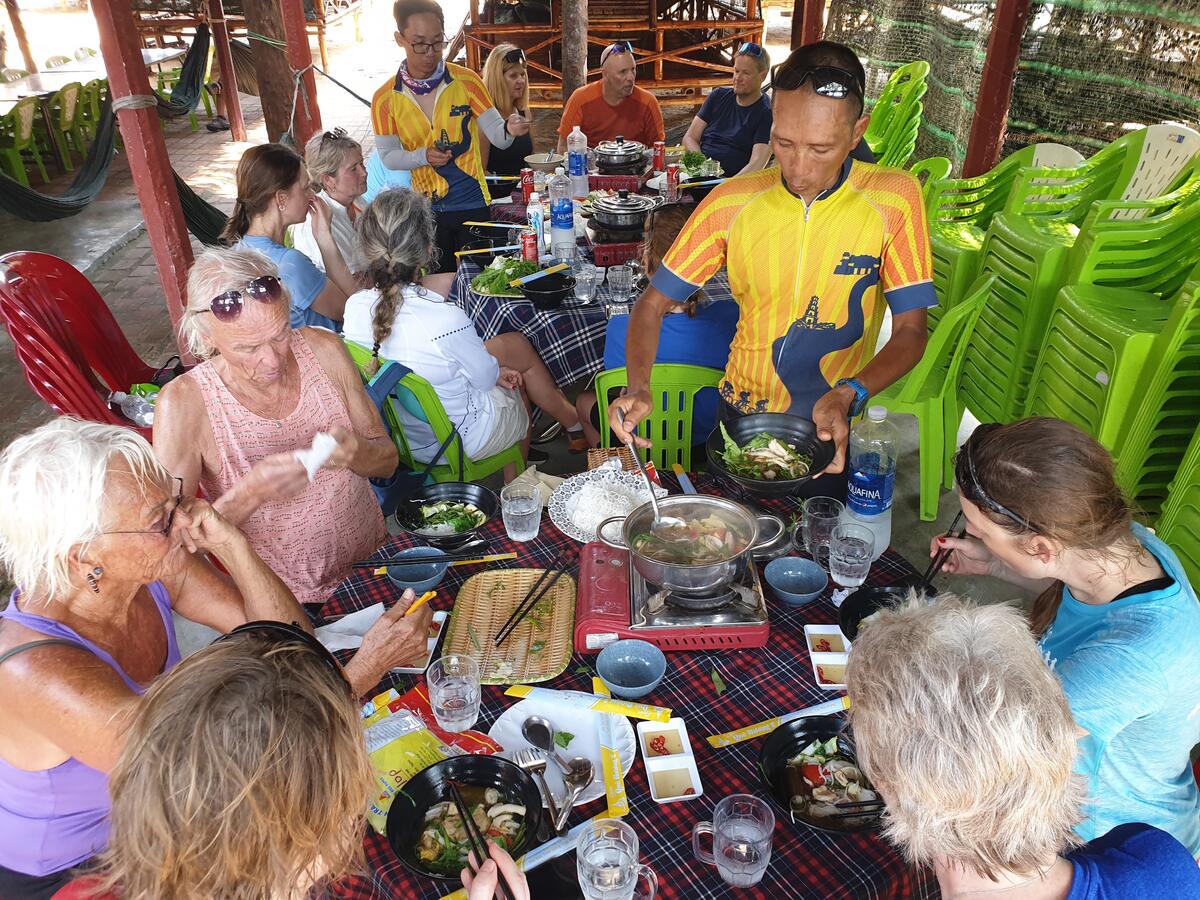 Vi stoppet regelmessig for forfriskninger og energipåfyll på små, lokale kafeer. De serverte også vietnamesisk kaffe, kjent for sin sterke og søte smak - og med et hint av herlig sjokoladesmak – en perfekt oppkvikker for slitne syklister! Lunsjene bestod av lokale vietnamesiske spesialiteter, ofte servert på små spisesteder hvor vi fikk smake på retter som jeg ikke engang har hørt om på vietnamesiske restauranter i Norge. Men også mer kjente retter, som Banh mi, den vietnamesiske baguetten inspirert av de franske kolonister, og pho, den berømte nudelsuppen, ble noen av våre favoritter.