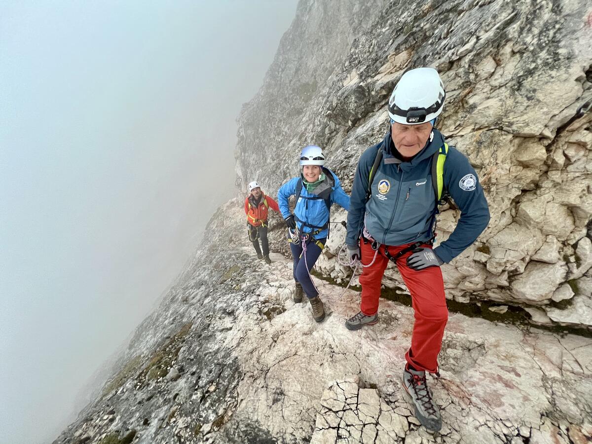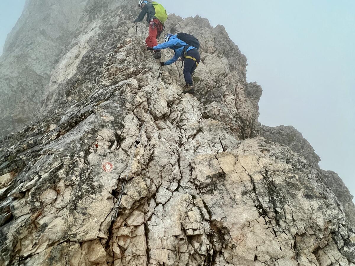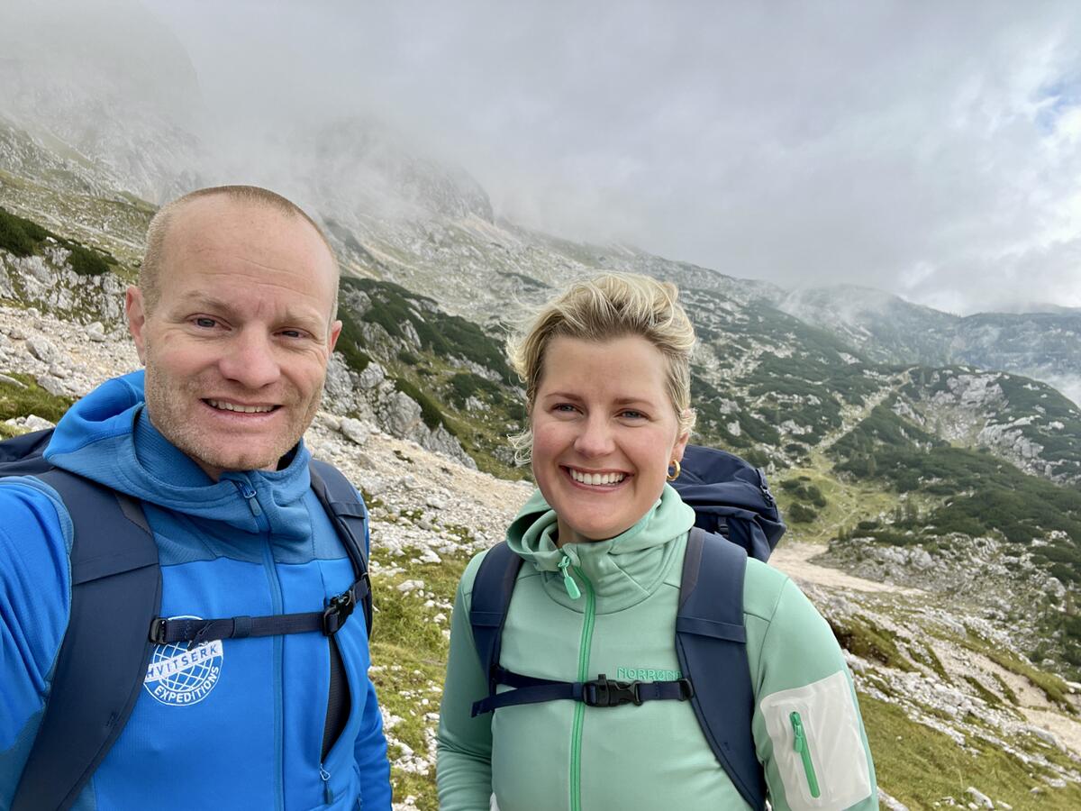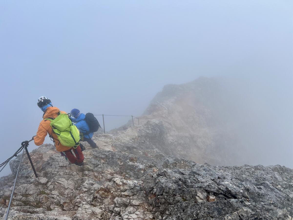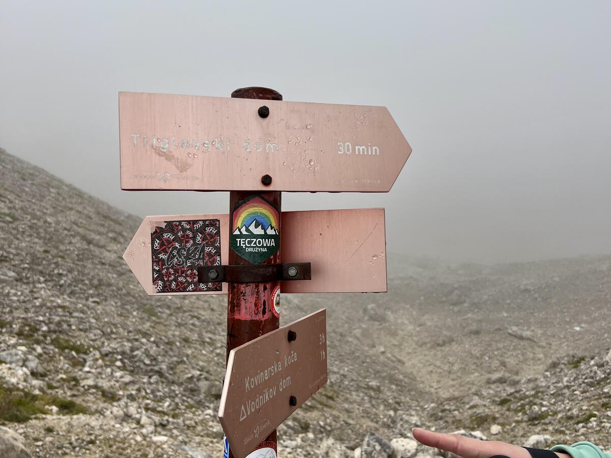 Sikt var det lite av,  men sammen med fjellguiden kom vi oss opp på Triglavs ikoniske topp. Det er noen partier med lett klyving, men vi er sikret i tau. Stemningen var god da vi kom på toppen og min kollega delte ut melkesjokolade – selv uten sikt! Deretter bar det tilbake til Kredarica for frokost og pakking.
