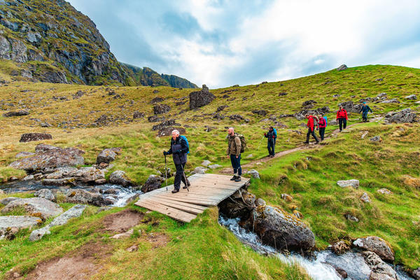 Lofoten kan være vått, med bratte stier som ofte kan være veldig gjørmete og glatte. Vær forberedt på å bli utfordret hvis disse forholdene er nye for deg, eller tren for slike fotturer før turen starter.