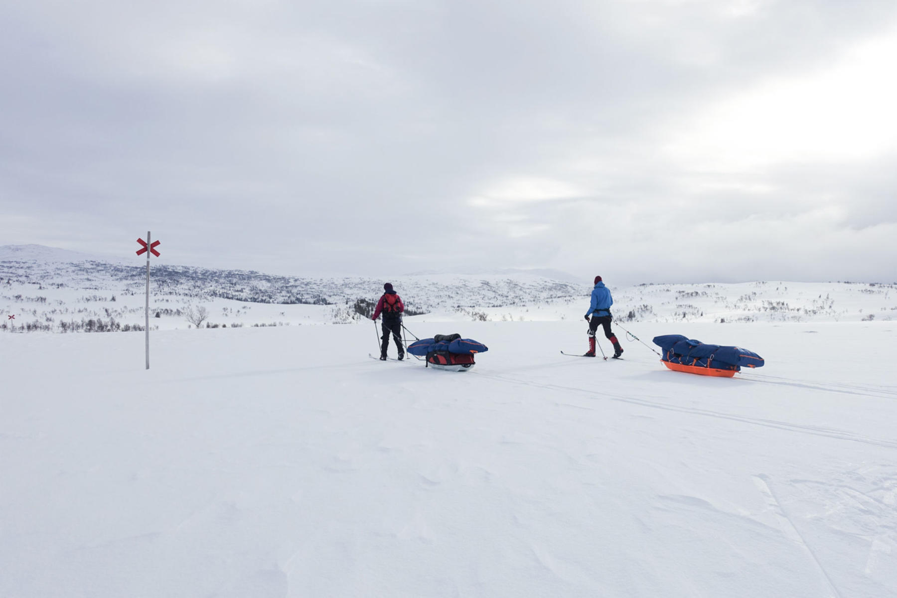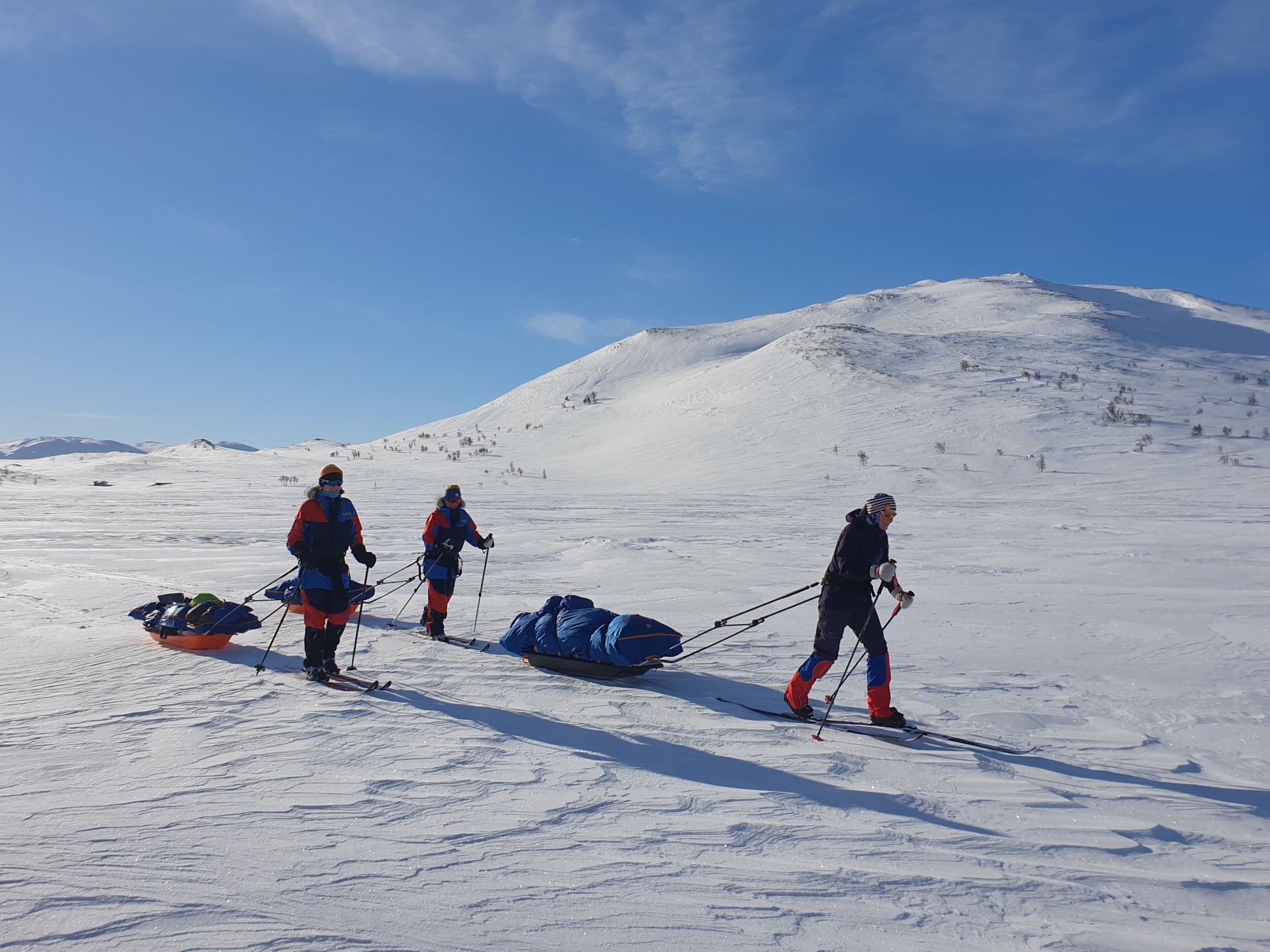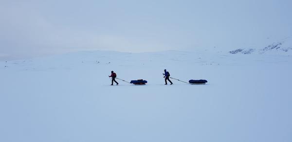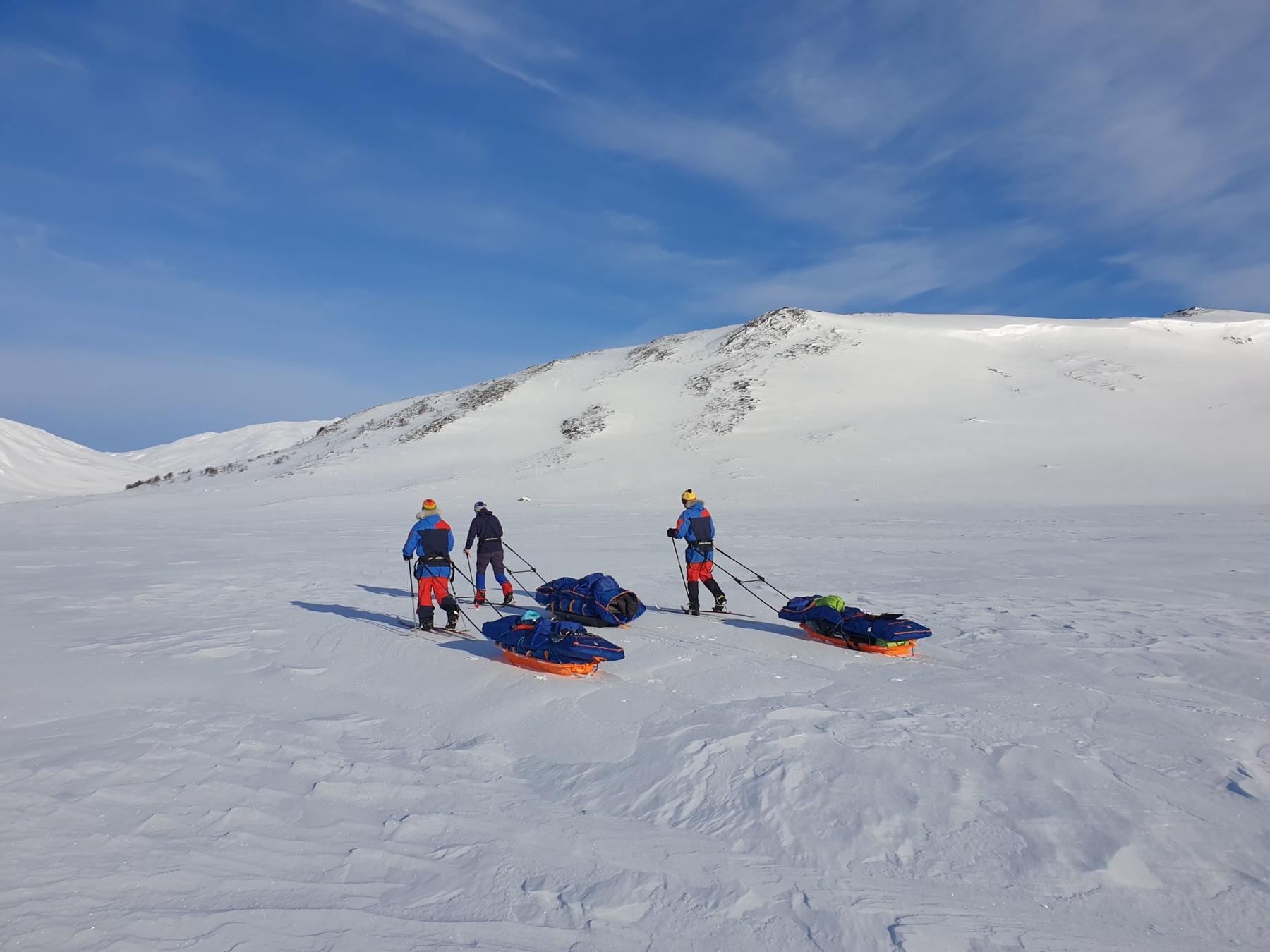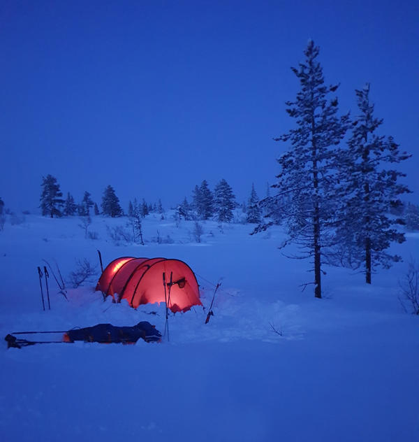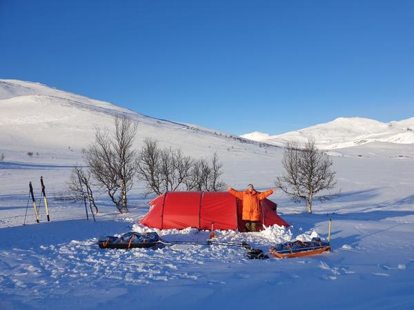Vi møtes på Værnes lufthavn klokken 08:30 (du kan ta nattog både sørfra og nordfra og være der i tide). Du velger selv om du vil overnatte på et hotell i nærheten eller komme samme dag med tog. Vi har en fellestransport til Væktarstua, dette tar ca 1,5 time. Her begynner eventyret. Dagens etappe er 20 km lang, og dersom forholdene tillater det går vi innom Svenskegrensa allerede i dag, men vi har med oss alt vi trenger i pulken, så vi tilpasser ruta etter form og føre. Vi legger inn en god lunsjpause underveis, og etter vi har slått opp camp spiser vi en enkel men særdeles etterlengtet middag.