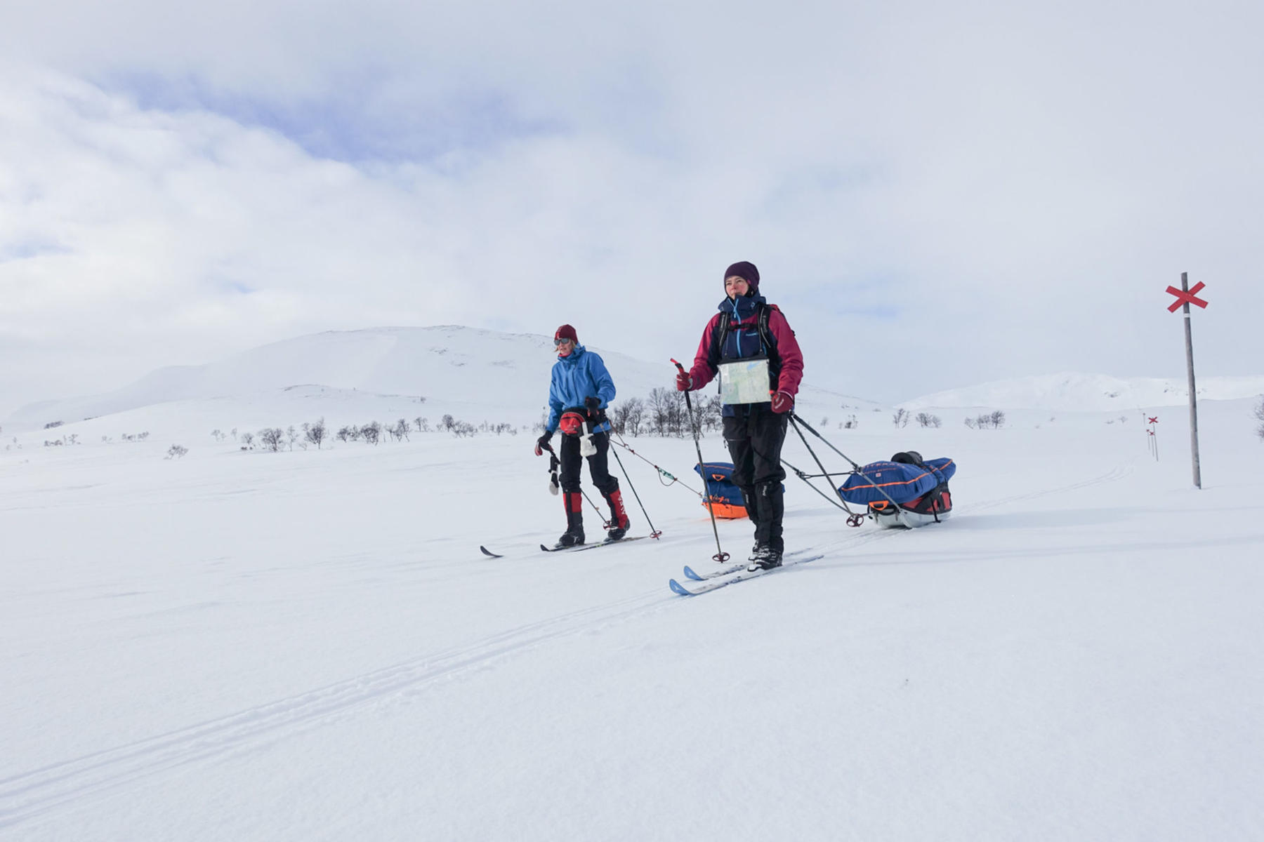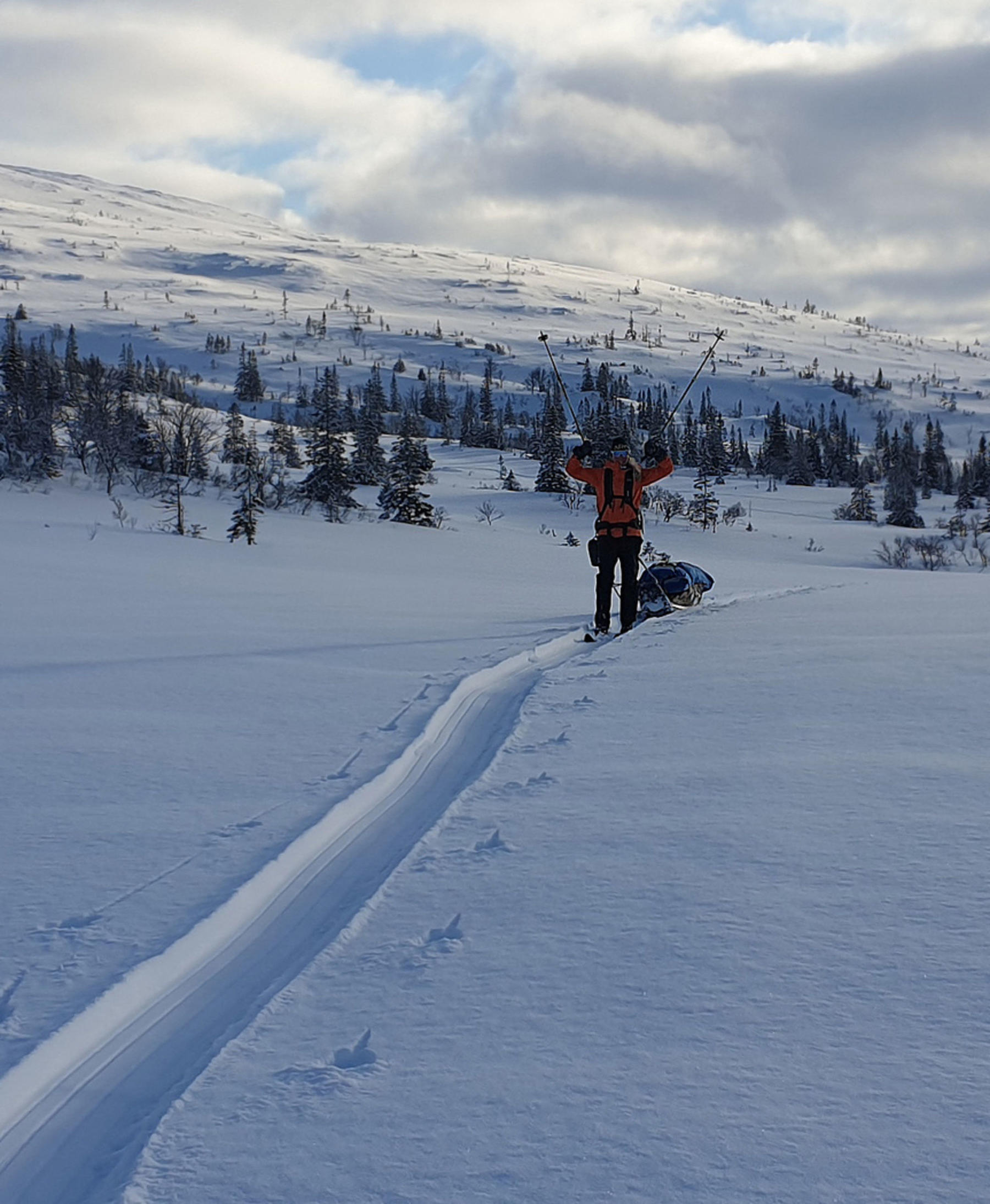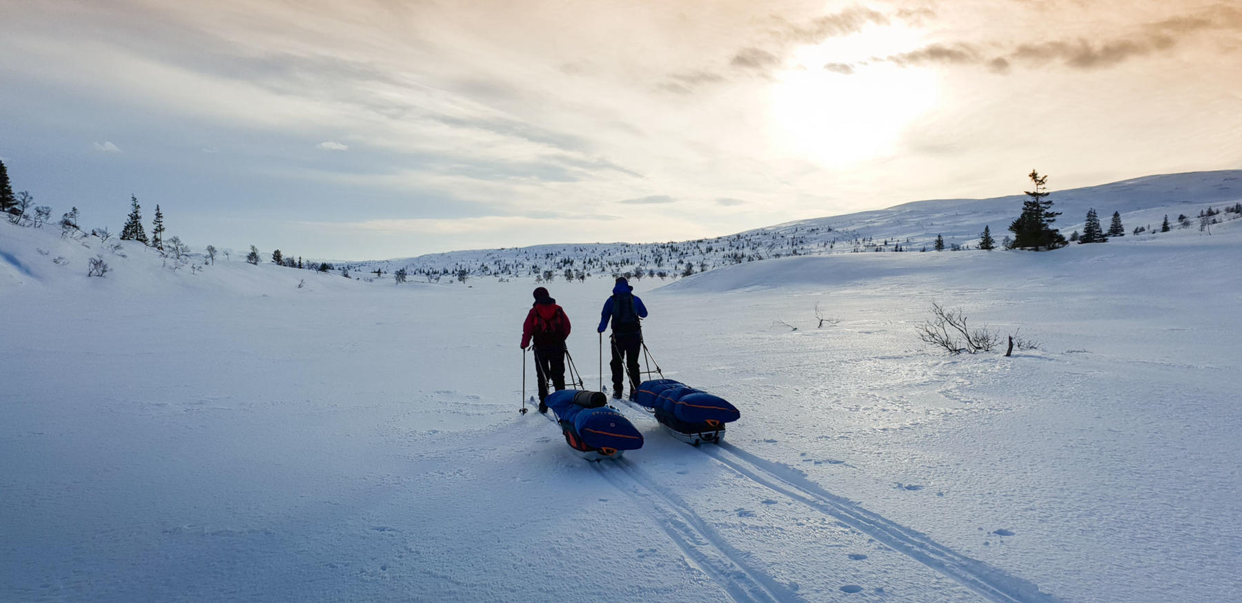 Vi møtes på Værnes lufthavn klokken 08:30 (du kan ta nattog både sørfra og nordfra og være der i tide). Du velger selv om du vil overnatte på et hotell i nærheten eller komme samme dag med tog. Vi har en fellestransport til Væktarstua, dette tar ca 1,5 time. Her begynner eventyret. Dagens etappe er 20 km lang, og dersom forholdene tillater det går vi innom Svenskegrensa allerede i dag, men vi har med oss alt vi trenger i pulken, så vi tilpasser ruta etter form og føre. Vi legger inn en god lunsjpause underveis, og etter vi har slått opp camp spiser vi en enkel men særdeles etterlengtet middag.